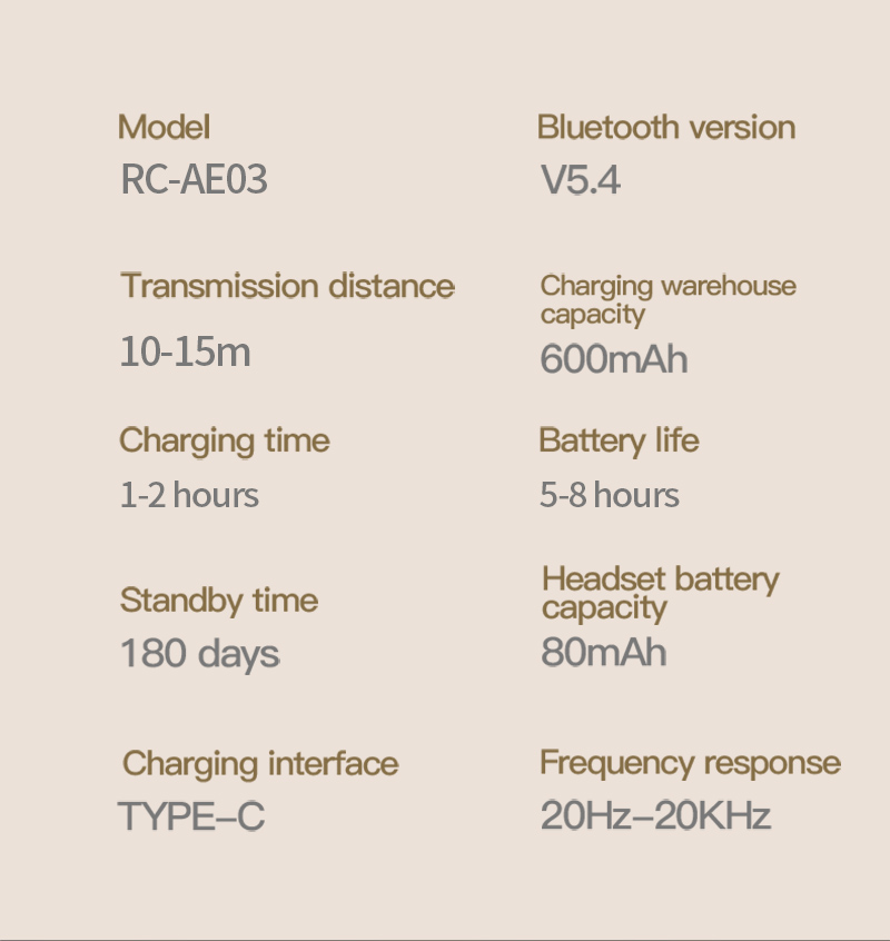 The RC-AE03 Smart AI Earbuds combine premium sound with intelligent features. Powered by Zhongke Lanxun 5656C Bluetooth 5.4+EDR chip, these earbuds offer ultra-clear HD music and calls with a 16.2mm composite wool + PU speaker. Enjoy 10 hours of playback, touch control, and IPX5 waterproof protection. Features include AI voice translation, pop-up pairing with Hall sensor, dual-ear touch control, game/music mode switch, and a 600mAh charging case with up to 3.5 recharges via Type-C.