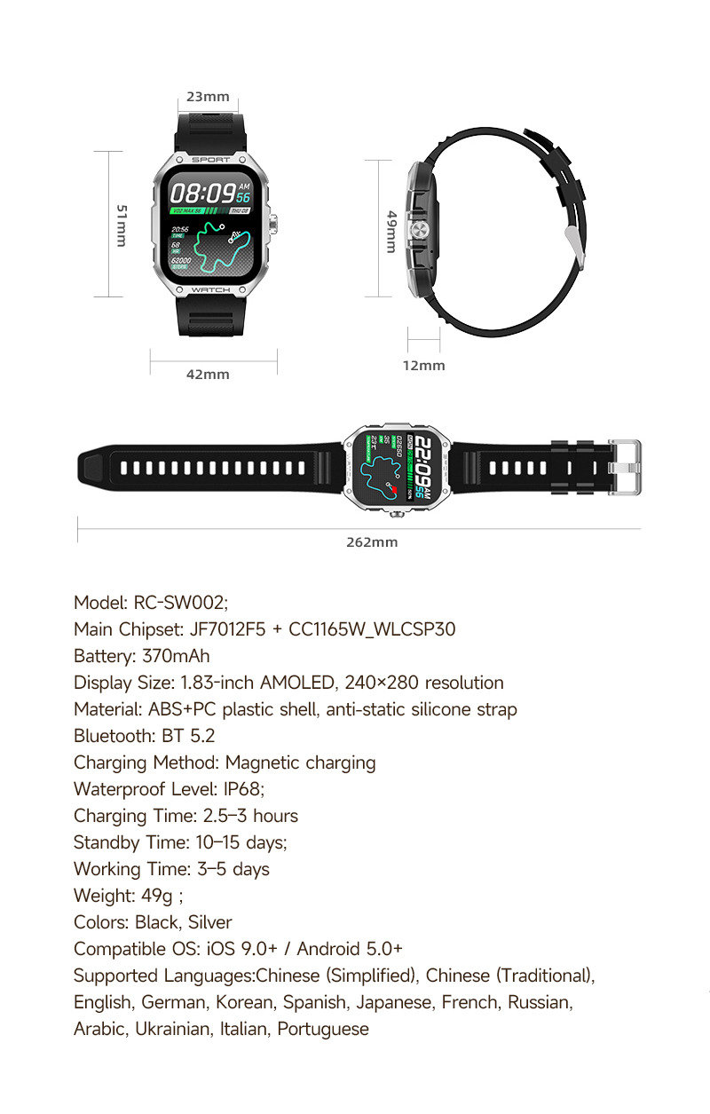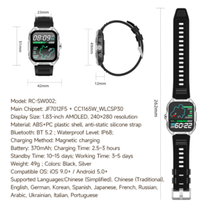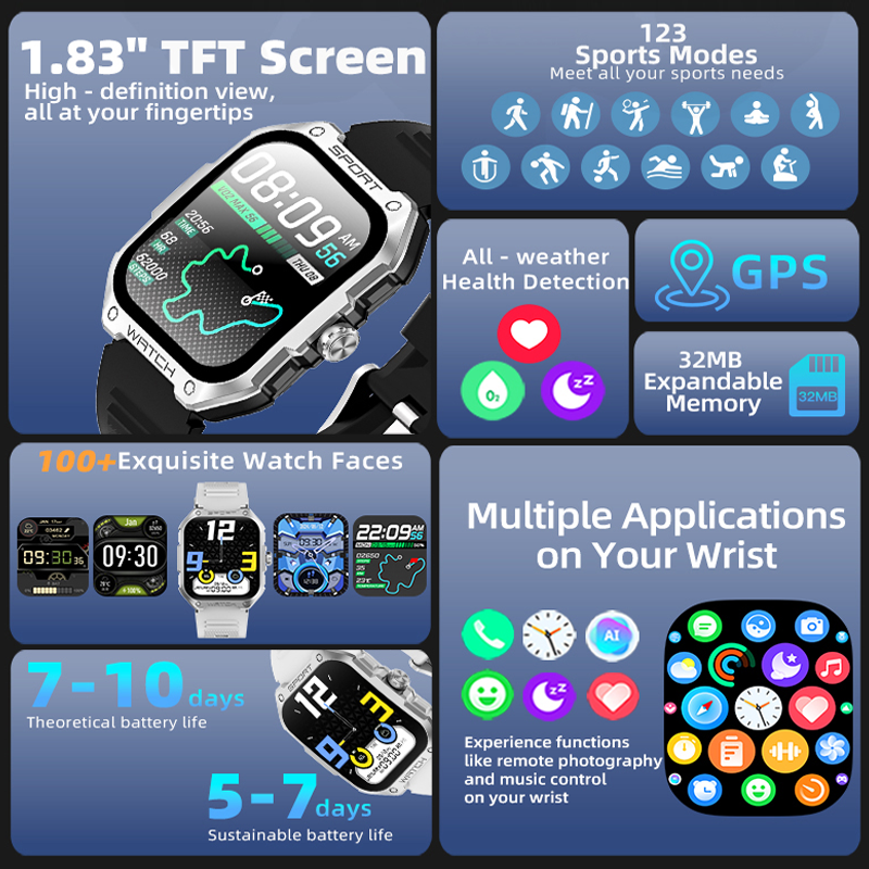 Discover the ultimate Smart AI Watch with advanced features for an active lifestyle. Equipped with 123 sports modes, GPS support (BeiDou, GPS, GLONASS, GALILEO), and Bluetooth calling, it keeps you connected and on track. The 1.83″ AMOLED retina display (240×280) offers crisp visuals, while the IP68 waterproof rating ensures durability during swimming or rain. With a 7-day battery life and magnetic charging, enjoy uninterrupted usage. Track heart rate, sleep stages, steps, calories, and more. Compatible with iOS 9.0+ and Android 5.0+. Perfect for fitness enthusiasts and daily use!